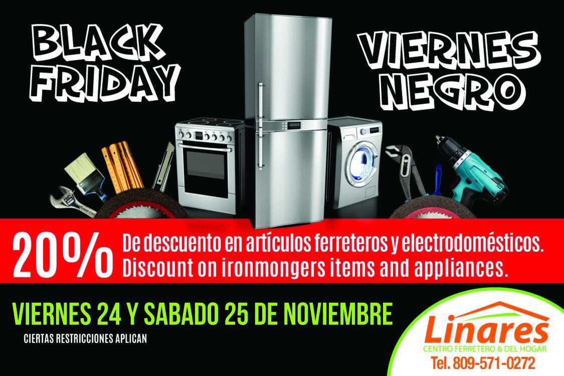 20% de descuento en artículos ferreteros y electrodomésticos. Válido del 24 al 25 de noviembre.